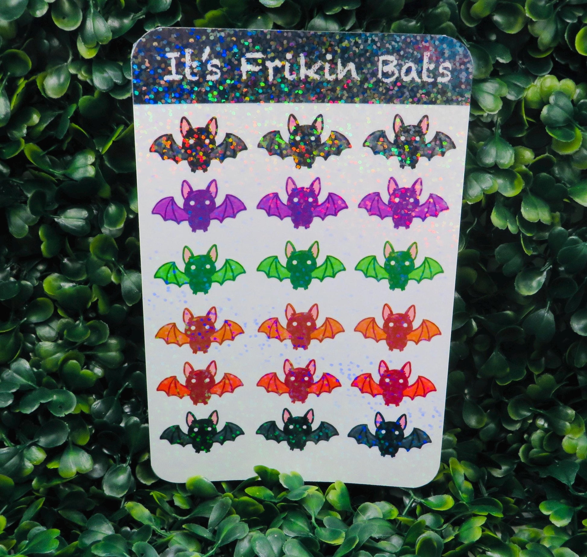 It’s frikin bats—I love Halloween! This sticker sheet features a full spooky rainbow of adorable bat friends, each with glittery holographic flair! From goth black to sweet green to candy-colored pinks and purples, these bats are perfect for decorating your journal, planner, laptop, or spooky season goodies.